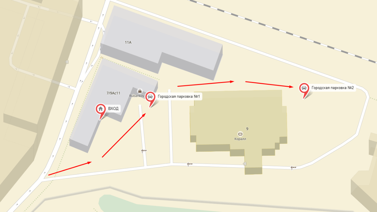 Перед зданием Центра повернуть направо, объехать здание слева вдоль забора. Справа увидите въезд на парковку