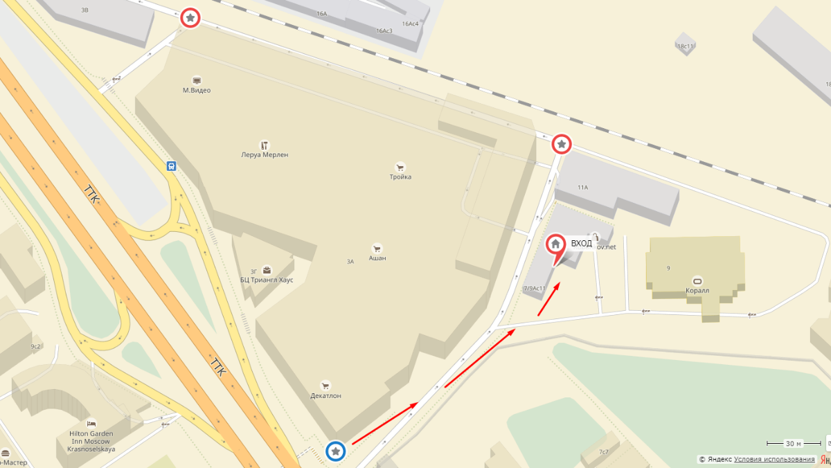 Красные звезды – въезды на парковку. Синяя звезда – выход из ТК «ТРОЙКА» на улицу